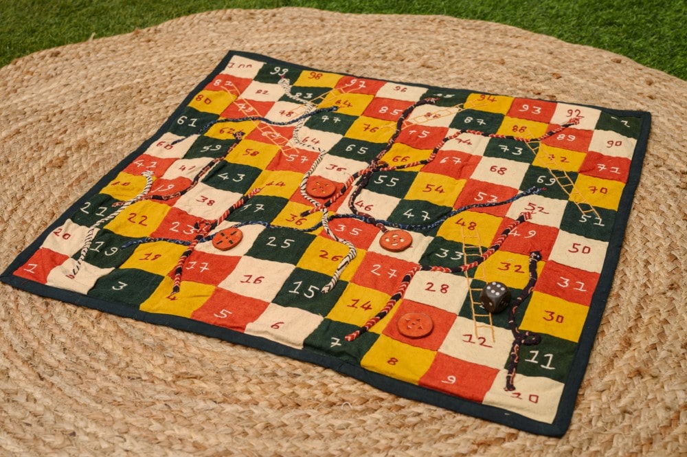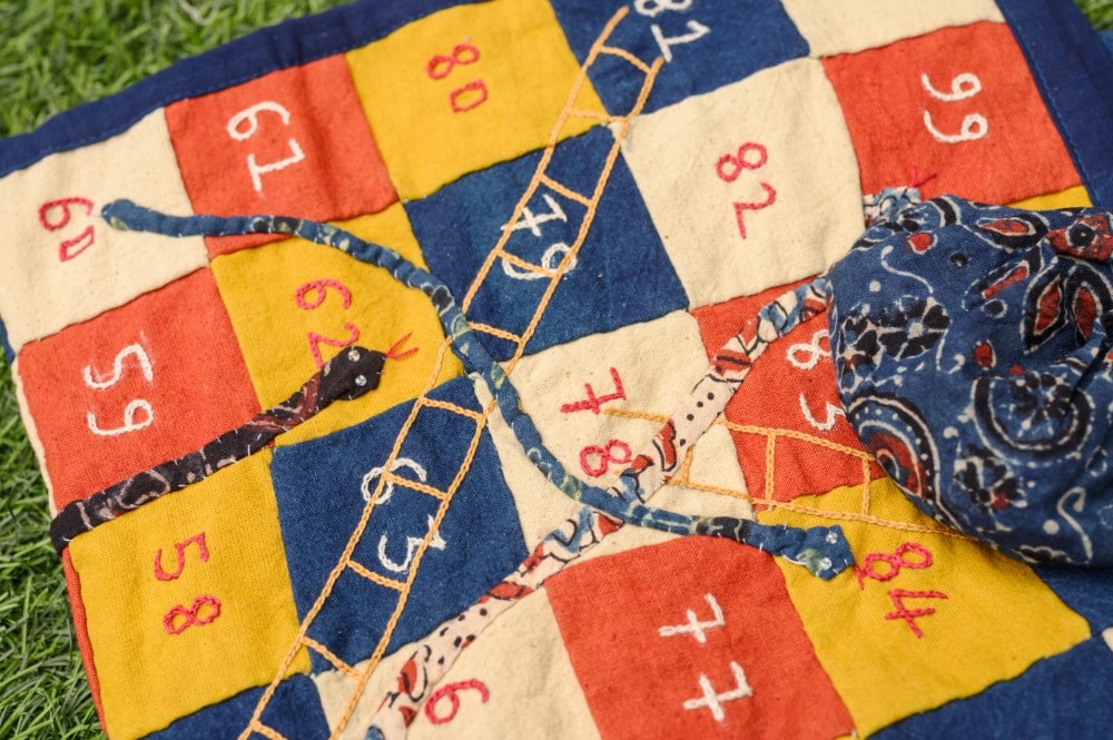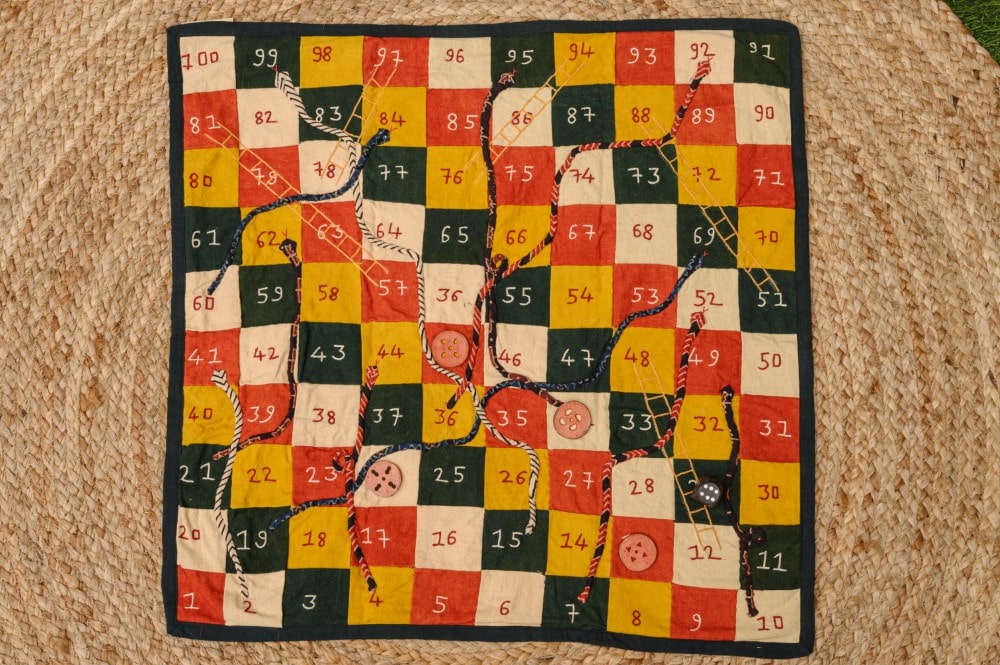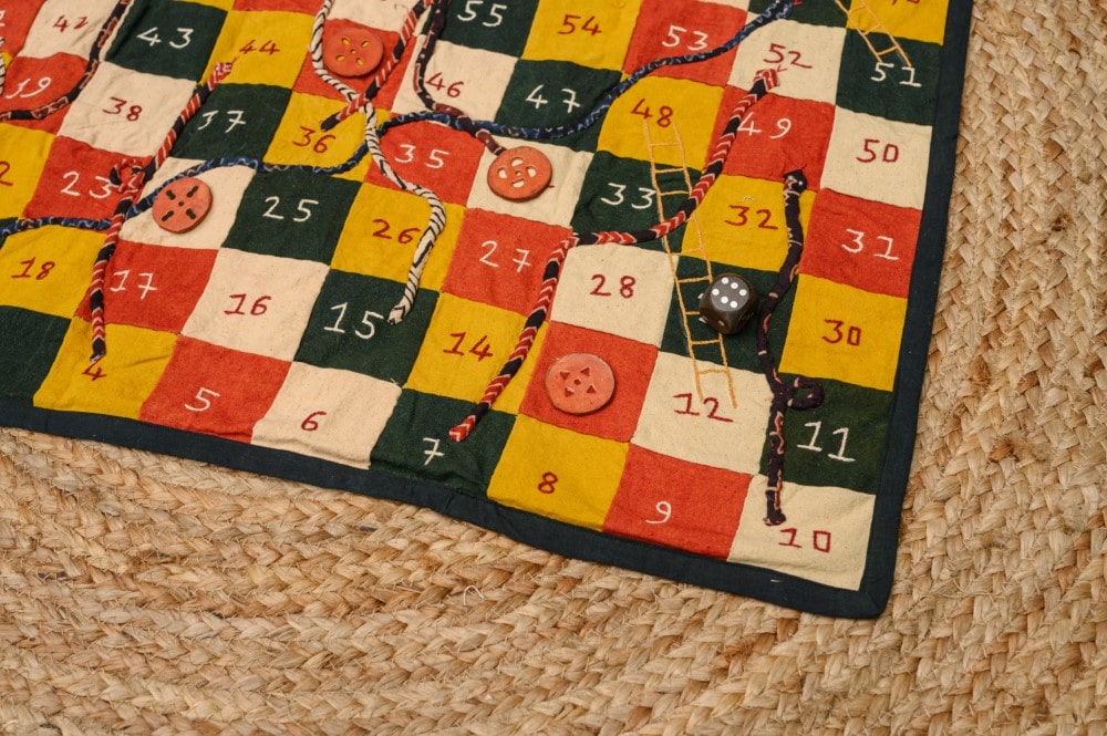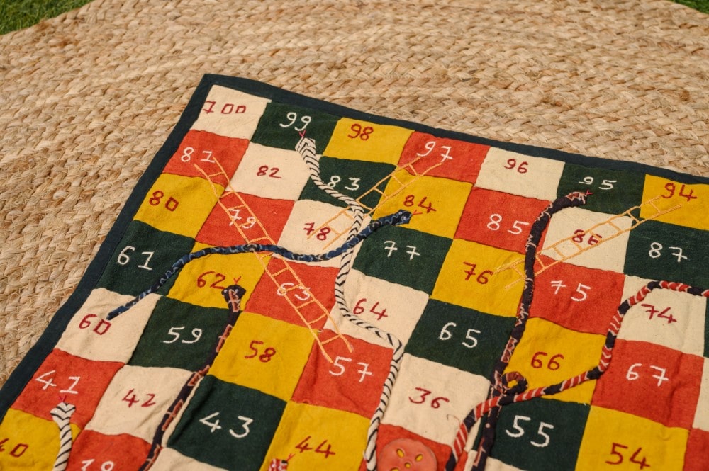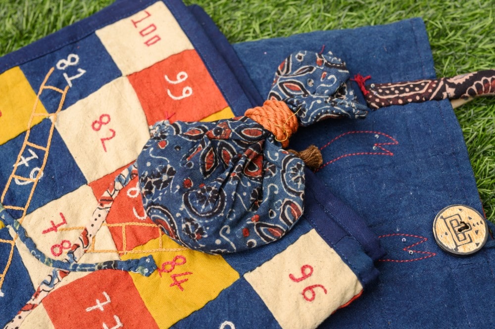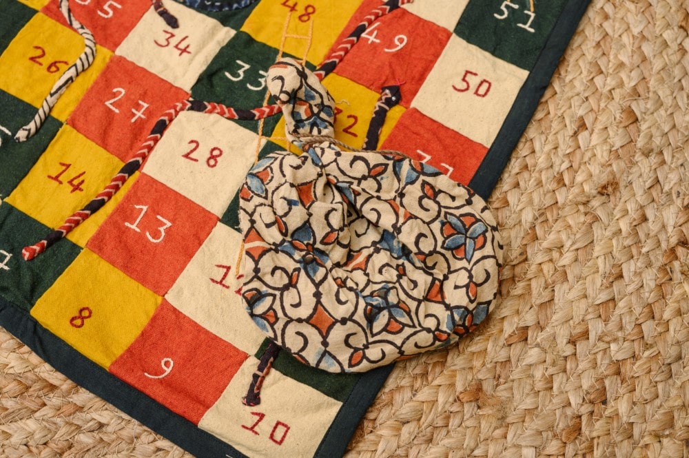 Rediscover the classic game in a whole new way with this charming Snakes & Ladders set, lovingly crafted by skilled senior women artisans of Kutch. Each square of the board is a testament to their expertise, adorned with intricate patchwork, appliqué, and delicate chain stitch, all done by hand.